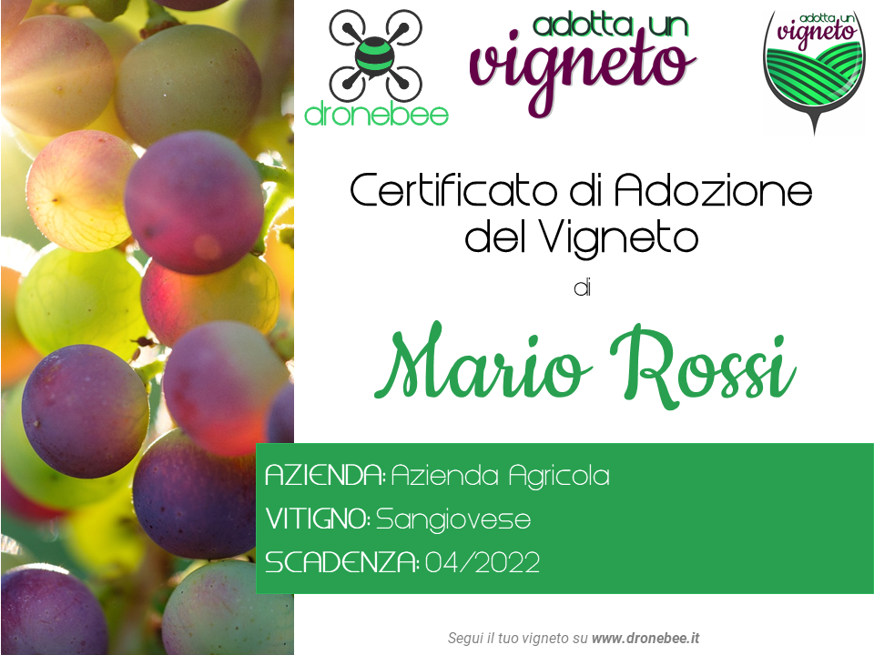 Hai sempre sognato di possedere una vigna, seguirne le fasi vegetative e produttive, controllare quando è il momento giusto per vendemmiare, ma non sai come soddisfare questo desiderio? Oggi il sogno può diventare realtà: è adesso possibile “adottare un vigneto” e osservarne l’evoluzione step by step, senza dover sostenere l’importante onere finanziario dell’acquisto o del costo di affitto. Grazie a DroneBee, una società innovativa che si occupa di consulenze, sensori, software e formazione nel campo dell’agricoltura di precisione (che in parole molto semplici, significa fare la cosa giusta, al posto giusto, al momento giusto) e del remote sensing (tecnicamente, “la disciplina tecnico-scientifica con finalità diagnostico-investigative che permette di ricavare informazioni, qualitative e quantitative, sull’ambiente e su oggetti posti a distanza grazie a sensori, generalmente montati su satelliti o droni”).